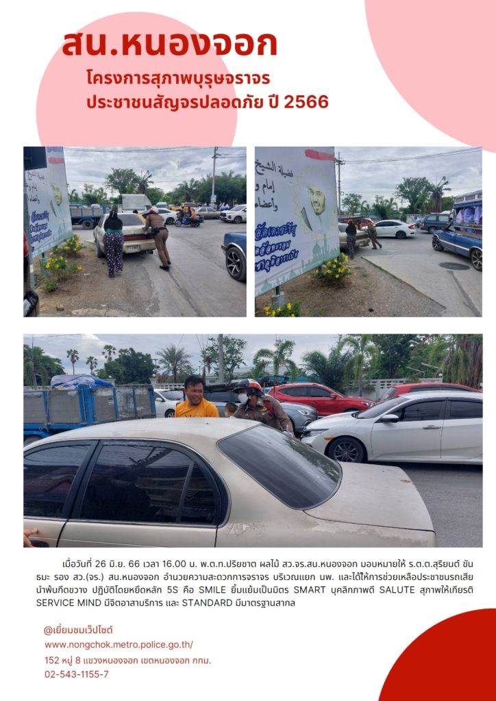 เมื่อวันที่ 26 มิ.ย. 66 เวลา 16.00 น. พ.ต.ท.ปริยชาต ผลไม้ สว.จร.สน.หนองจอก มอบหมายให้ ร.ต.ต.สุริยนต์ ขันธมะ รอง สว.(จร.) สน.หนองจอก อำนวยความสะดวกการจราจร บริเวณแยก นพ. ถนนมิตไมตรี แขวงหนองจอก เขตหนองจอก กทม. และได้ใ้ห้การช่วยเหลือประชาชนรถเสีย นำพ้นกีดขวาง ปฏิบัติโดยหยึดหลัก 5S คือ SMlLE ยิ้มแย้มเป็นมิตร SMART บุคลิกภาพดี SALUTE สุภาพให้เกียรติ SERVICE MlND มีจิตอาสาบริการ และ STANDARD มีมาตรฐานสากล