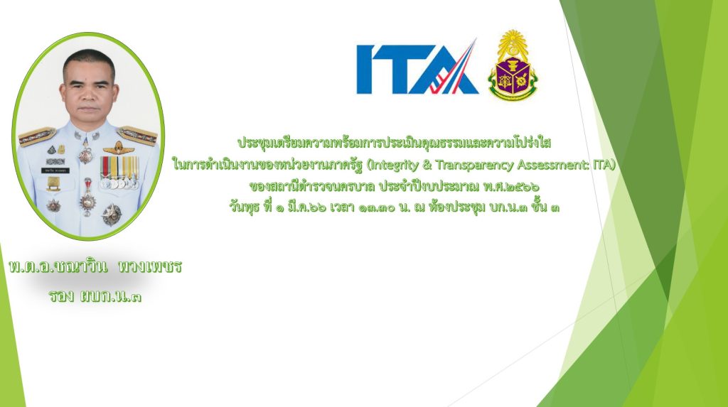 เมื่อวันที่ 1 มี.ค. 2566 เวลา 13.30 น. พ.ต.อ.ชณาวิน พวงเพชร รอง ผบก.น.3 ประธานการประชุมหารือในการขับเคลื่อนเเละกำกับติดตามการประเมิณคุณธรรมเเละความโปร่งใสในการดำเนินการของหน่วยงานภาครัฐ ( Integrity & Transparency Assessment :ITA ) ของสถานีตำรวจนครบาลประจำปีงบประมาณ พ.ศ.2566 ณ ห้องประชุม ชั้น 3 บก.น.3 โดยผู้เข้าร่วมประชุมประกอบด้วย ผกก.ฝอ.บก.น.3 รอง ผกก.ฝอ.บก.น.3 ที่รับผิดชอบงาน (ITA) สว.ฝอ.บก.น.3 เเละเจ้าหน้าที่รับผิดชอบงาน (ITA) เจ้าหน้าที่ตำรวจที่รับผิดชอบงาน ITA ทุก สน. ระดับ สว. ขึ้นไป เจ้าหน้าที่ตำรวจที่รับผิดชอบงาน ITA ทุก สน. (เจ้าหน้าที่ Admin)