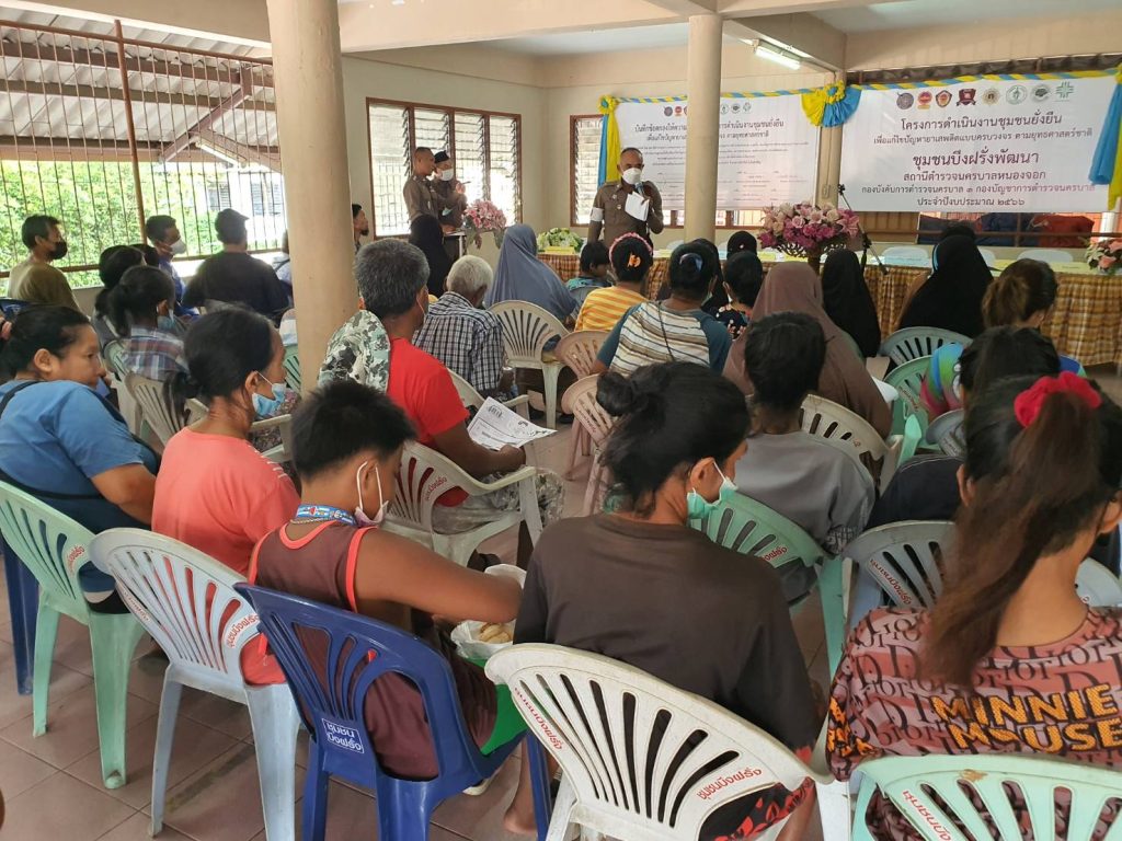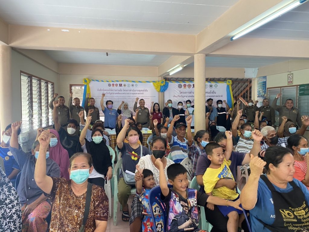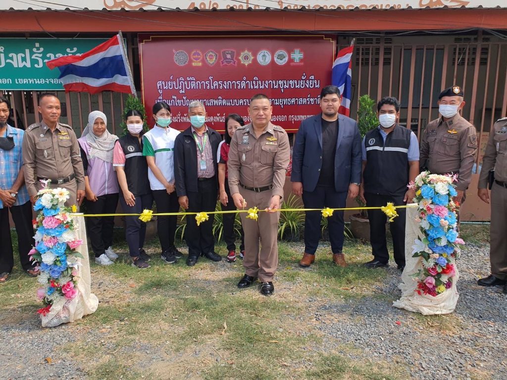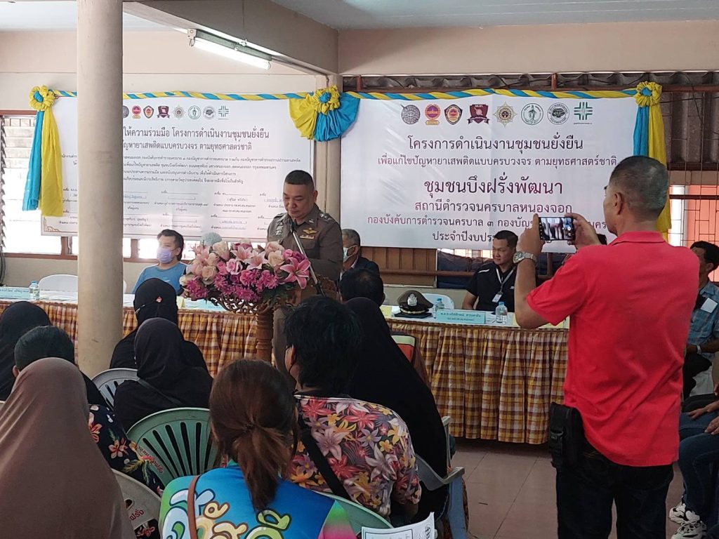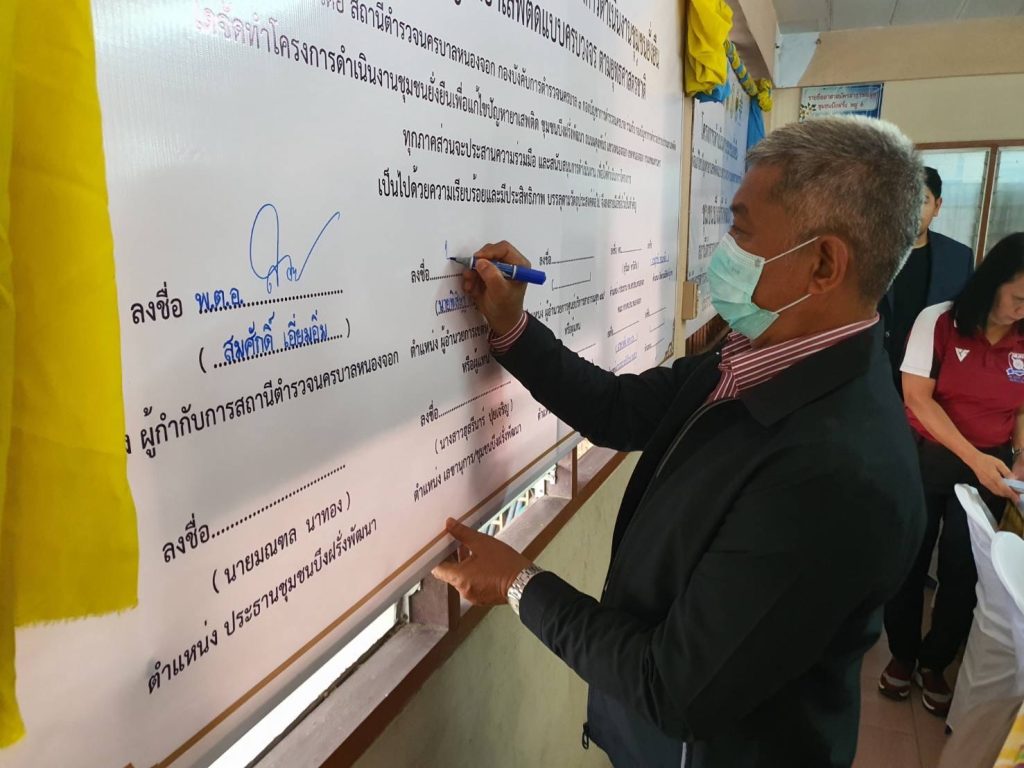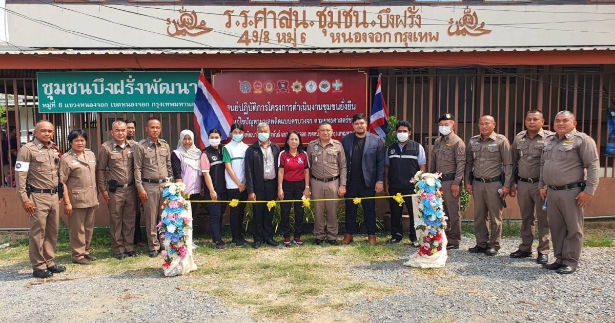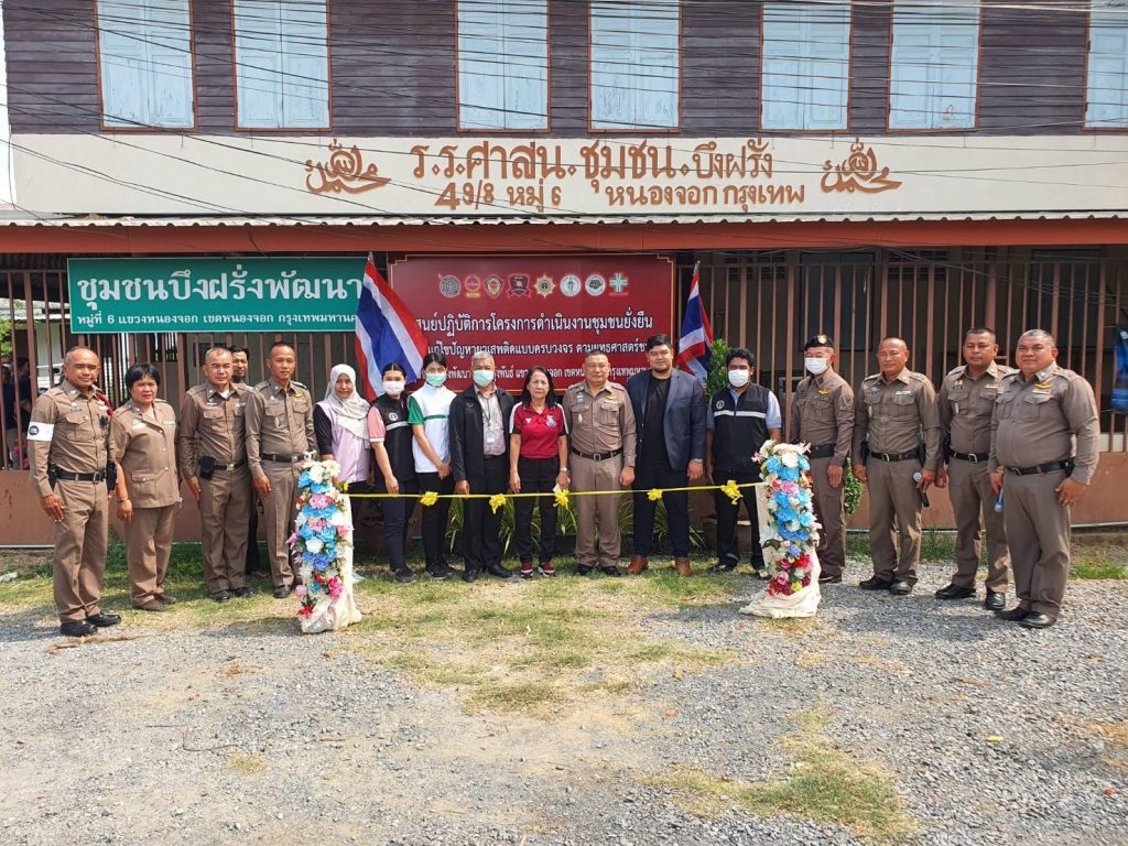 ประธานชุมชนบึงฝรั่งพัฒนา น.ส.ฮุสรีนาร์ ปุยเจริญ เลขานุการชุมบึงฝรั่งพัฒนา นายสมศักดิ์ บังการีม กรรมการชุมชนบึงฝรั่งพัฒนา ร่วมพิธีเปิดฯ และร่วมลงนามในบันทึกข้อตกลง MOU ตามโครงการชุมชนยั่งยืน เพื่อแก้ไขปัญหายาเสพติดแบบครบวงจร ตามยุทธศาสตร์ชาติและมอบสิ่งของให้ประชาชนในชุมชนจำนวน 60 ครัวเรือน มอบถุงยังชีพให้ผู้ป่วยติดเตียง/ผู้พิการในชุมชนจำนวน 5 ราย ณ ชุมชนบึงฝรั่งพัฒนา ถนนผดุงพันธ์แขวงหนองจอก เขตหนองจอก กรุงเทพมหานคร