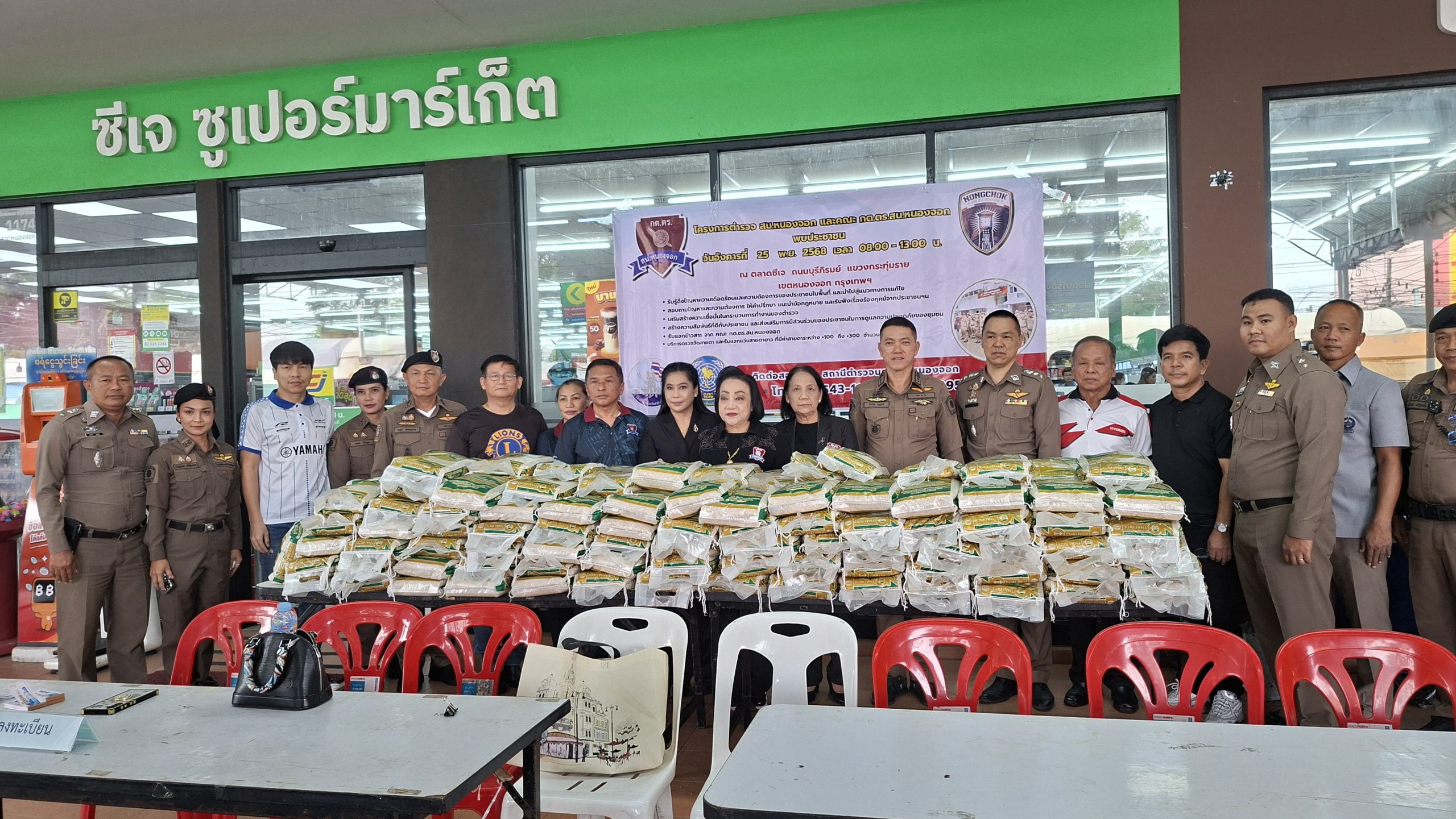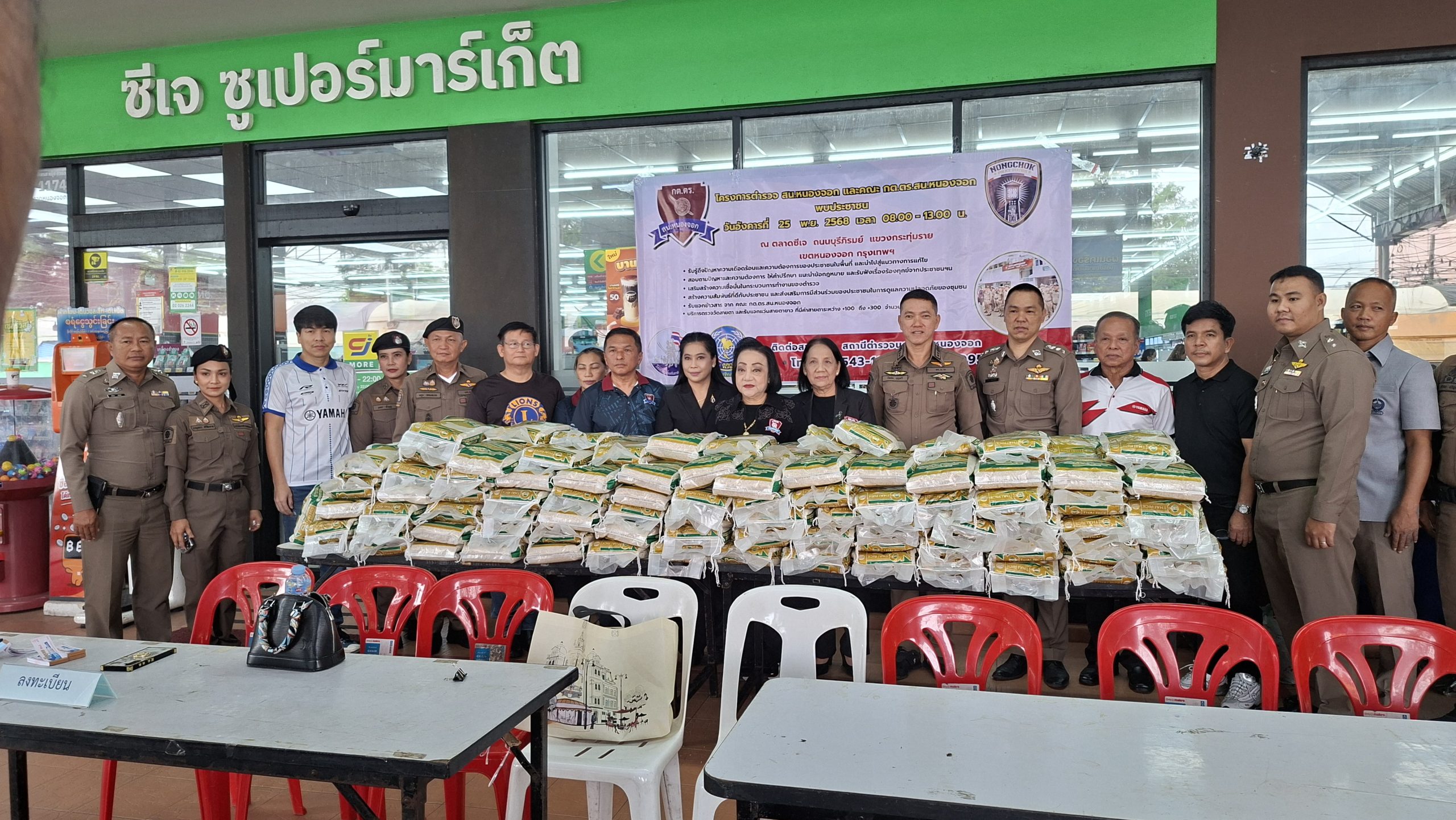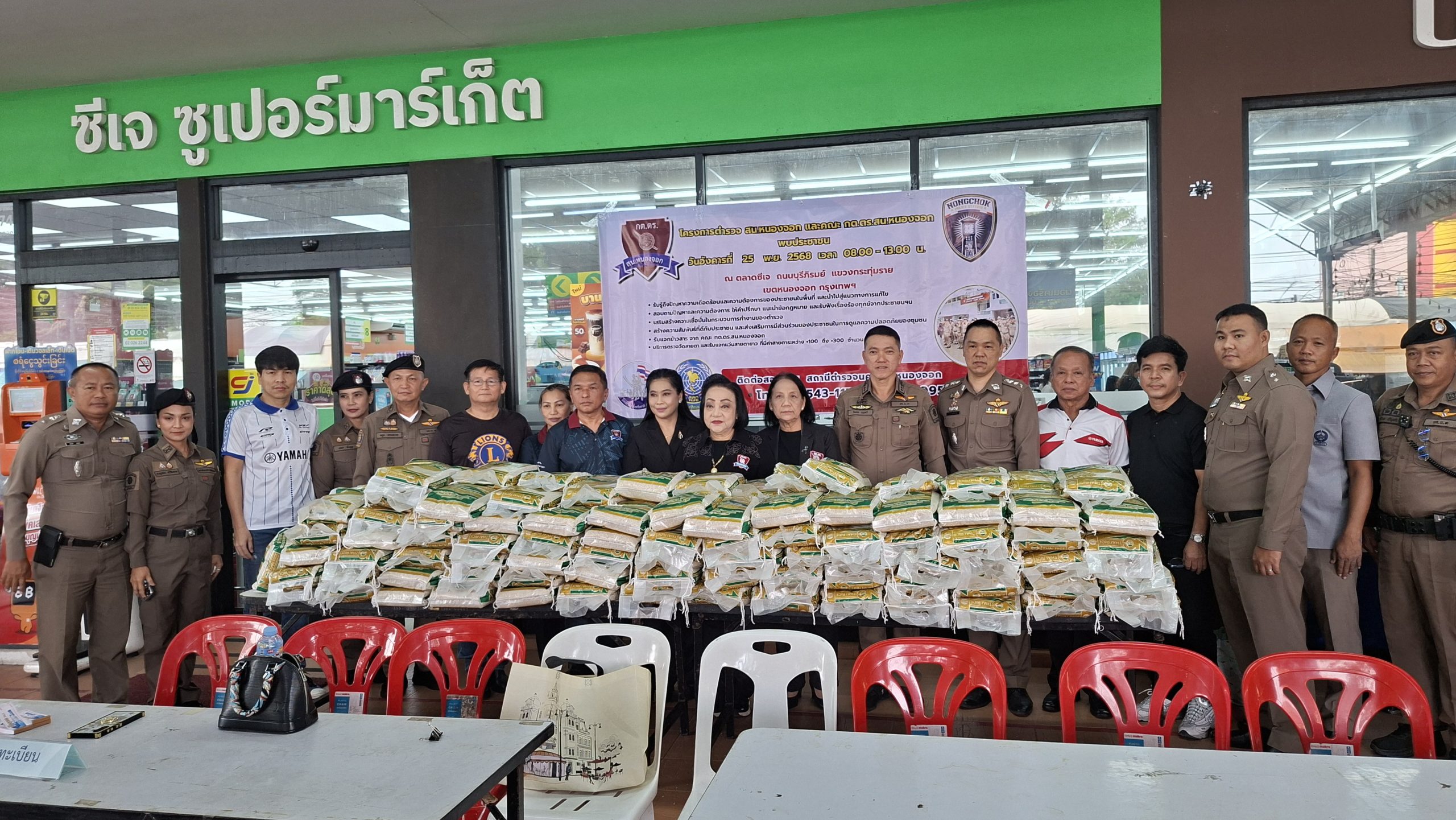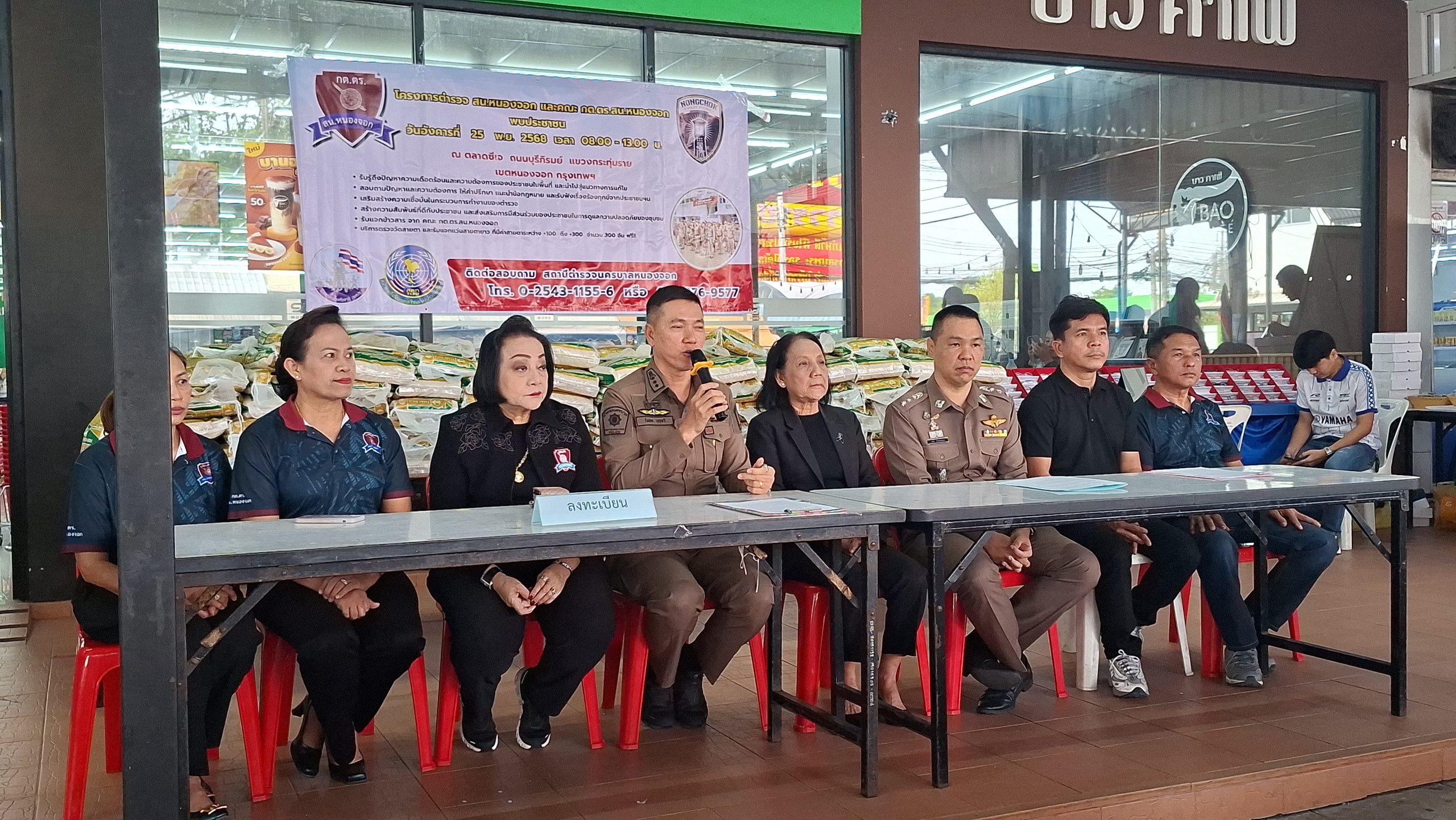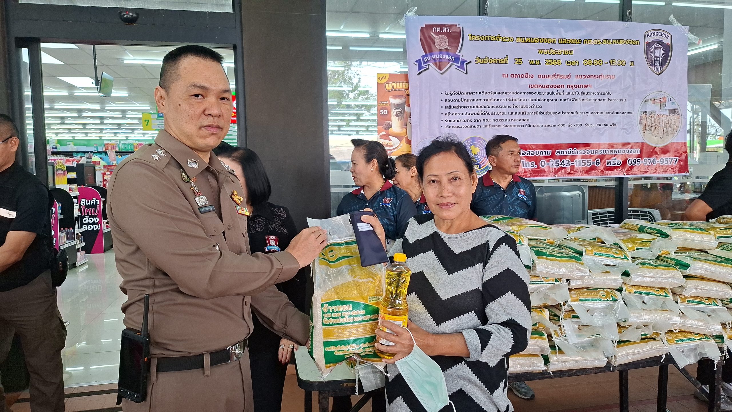 วันอังคารที่ 25 พ.ย. 2568 เวลา 08.00 – 13.00 น. ณ ตลาดซีเจ ถ.บุรีภิรมย์ พ.ต.อ.โฆษิต บุญทวี รอง ผบก.น.3 เป็นประธานเปิดโครงการตำรวจ และคณะ กต.ตร.สน.หนองจอก พบประชาชน พ.ต.อ.สกล อิงอุดมนุกูล ผกก.สน.หนองจอก ดร.สุวิมล หวังกิจ ประธาน กต.ตร.สน.หนองจอก และคณะ กต.ตร.สน.หนองจอก ข้าราชการตำรวจ สน.หนองจอก ประชาชนชาวหนองจอก ร่วมกิจกรรม โดยมีวัตถุประสงค์เพื่อ รับรู้ถึงปัญหาความเดือดร้อนและความต้องการของประชาชนในพื้นที่ และนำไปสู่แนวทางการแก้ไข สอบถามปัญหาและความต้องการ ให้คำปรึกษา แนะนำข้อกฎหมาย และรับฟังเรื่องร้องทุกข์จากประชาชนฯ เสริมสร้างความเชื่อมั่นในกระบวนการทำงานของตำรวจ สร้างความสัมพันธ์ที่ดีกับประชาชน และส่งเสริมการมีส่วนร่วมของประชาชนในการดูแลความปลอดภัยของชุมชน ในงาน คณะ กต.ตร.ได้มอบ ข้าวสารและน้ำมันพืช บริษัทยามาฮ่าวรภัณฑ์ ปราจีนบุรี บริการตรวจวัดสายตา และแจกแว่นตา ค่าสายตาระหว่าง +1.00 D ถึง +3.00 D จำนวน 300 อัน แก่ประชาชนที่มาร่วมงาน ฟร๊ มีผู้เข้าร่วมงานประมาณ 300 คน และมีการประชาสัมพันธ์โครงการประเมิน ITA ของ สน.หนองจอก ให้กับประชาชนที่มาร่วมงานทราบ